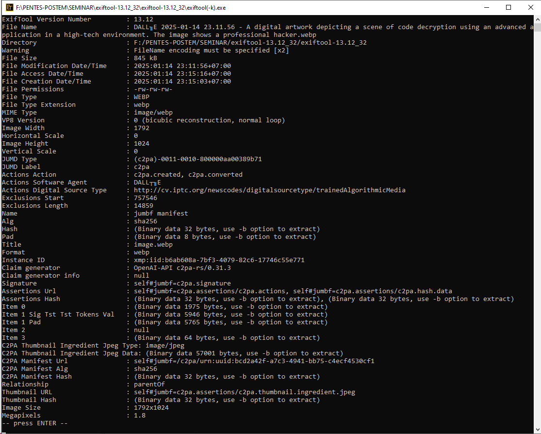 Jika pengguna atau pengembang ingin menambahkan metadata tambahan, mereka dapat melakukannya secara manual setelah gambar dihasilkan, menggunakan alat seperti ExifTool. Namun, langkah ini terpisah dari proses pembuatan gambar itu sendiri, dan tidak dilakukan otomatis oleh model AI. Oleh karena itu, gambar AI cenderung tidak memiliki metadata yang rumit karena tidak ada mekanisme atau kebutuhan untuk menyertakan informasi tersebut dalam alur kerja pembuatan gambar.
