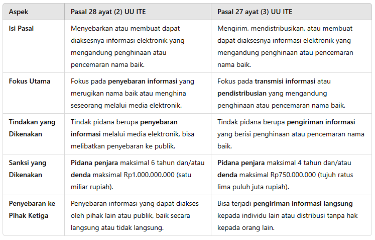 • Pasal 27 ayat (3) lebih menekankan pada pengiriman informasi langsung atau transmisi tanpa hak, yang bisa saja terjadi dalam percakapan pribadi atau distribusi yang lebih terbatas.